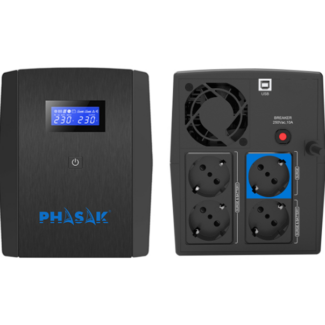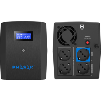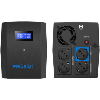 UPS Phasak de 800 VA com tecnologia digital interactiva. Foram objecto de rigorosos testes e controlos de qualidade, superando estas provas de forma satisfatória. Têm um controlo por microprocessador para um rendimento e encerramento do sistema óptimo. O Software de Gestão, que poderá descarregar na Internet e instalar segundo as suas necessidades, faz com que a UPS seja completamente integrável com o seu sistema. Com estas UPS de linha interactiva as tensões demasiado baixas ou altas são automaticamente corrigidas sem usar a bateria. Esta função garante a disponibilidade do tempo máximo de back-up em caso de uma interferência na tensão eléctrica oferecendo uma protecção fiável e de longa duração. Com monitorização através de porta USB e protecção de uma porta RJ-45 e cabo coaxial. Dispõe ainda de uma porta USB para carregar dispositivos.