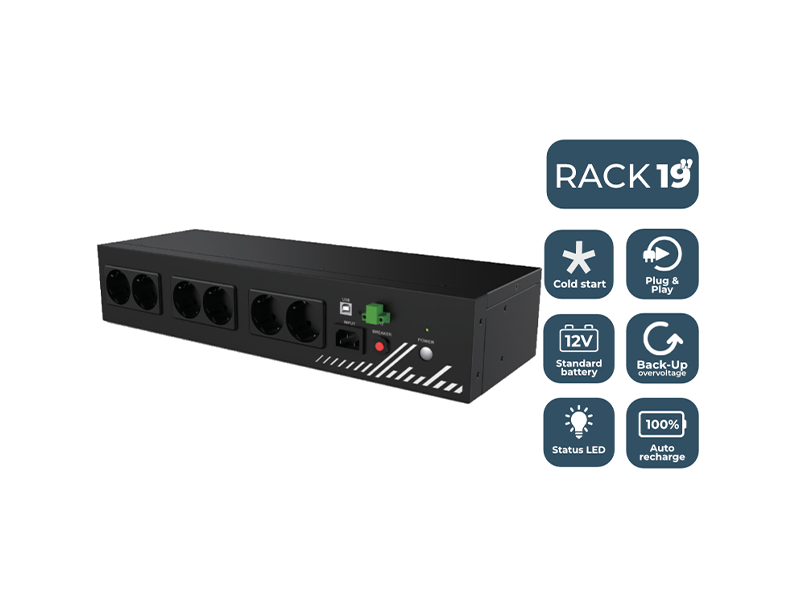 UPS 800VA / 480W Standby com 8 tomadas Schuko Rack 2U 19″